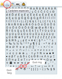 Per afegir els guions mig i llarg, cal que pitjeu el botó Caràcters especials, i trieu d’entre els símbols que se us desplegaràn els que indiquem en la imatge següent: